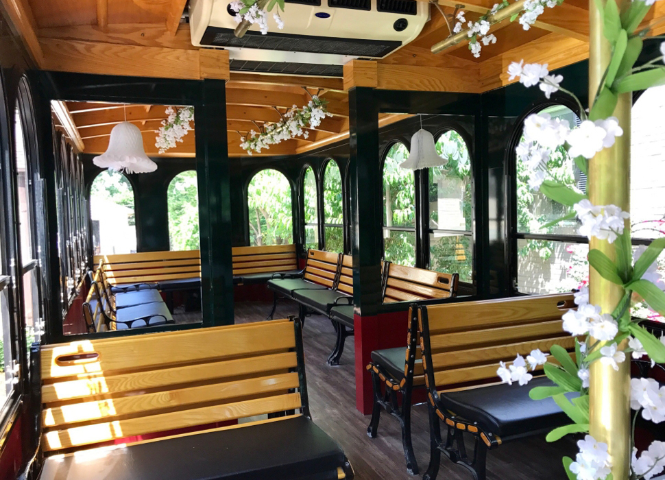 Seating: This trolley has a mix of perimeter and forward facing seats and is also handicap accessible. The brass railing and hand grabs make this unique ride to your desired destination a special treat.
